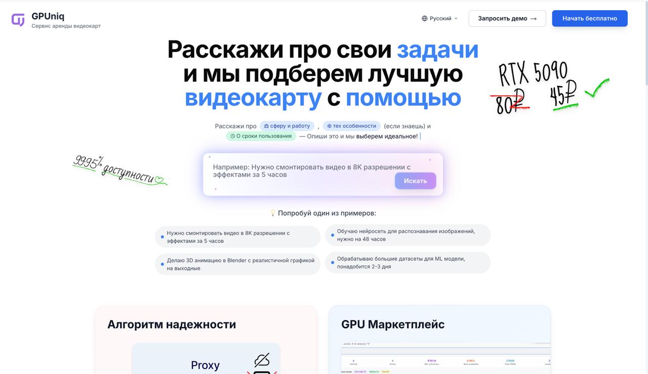 GPUniq — это высокопроизводительная платформа аренды GPU-ресурсов, созданная для разработчиков, стартапов и исследователей, работающих с искусственным интеллектом, машинным обучением и ресурсоёмкими вычислениями. Платформа агрегирует GPU от множества независимых провайдеров и частных операторов в единую децентрализованную инфраструктуру, автоматически подбирая оптимальные видеокарты под конкретные задачи пользователя.